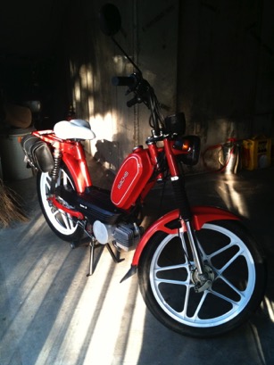 前のはイタリア・ホンダだったのですが、今度の素敵なオレンジ(光で赤く見えますが)のバイクは、ドイツのモペット車でオプティマ50というものです。こちらは自転車とバイクの間のような存在で、乗り心地はおもちゃのようで楽しく、可愛らしいです。